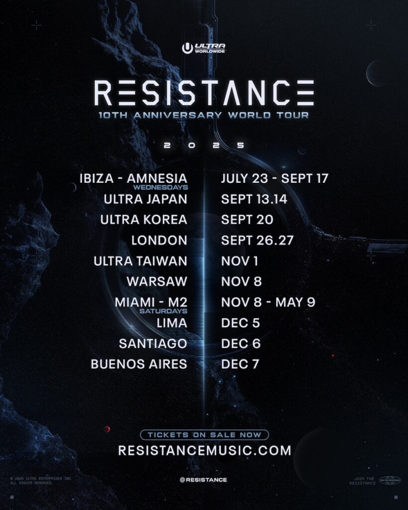 Beyond standalone shows and residencies, the brand will also return to ULTRA festival stages in Asia, including ULTRA Japan, ULTRA Korea, and ULTRA Taiwan, further cementing its global reach. With a decade of groundbreaking productions and unforgettable performances, the 10th Anniversary World Tour underscores RESISTANCE’s legacy as one of the defining forces in house and techno.