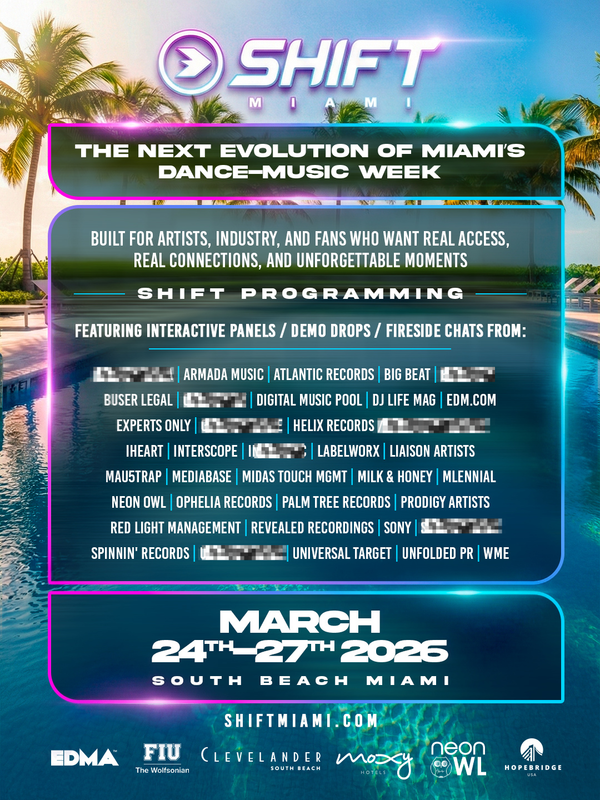 At the core of SHIFT Miami is its recently announced programming slate, which features interactive panels, demo drops, and fireside chats led by an impressive cross-section of the industry. Participating organizations and companies include Armada Music, Atlantic Records, Big Beat, Buser Legal, Digital Music Pool, DJ LIFE Magazine, EDM.com, Experts Only, Helix Records, iHeart, Interscope, LabelWorx, Liaison Artists, Mailstrap, Mediabase, Midas Touch Mgmt, Milk & Honey, Mlenial, Neon Owl, Ophelia Records, Palm Tree Records, Prodigy Artists, Red Light Management, Revealed Recordings, Sony, Spinnin’ Records, Universal, Target, Unfolded PR, and WME.