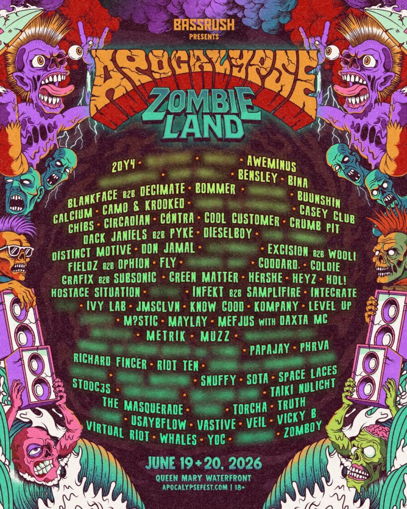 Insomniac’s Bassrush has unveiled a massive phase one lineup for the 2026 edition of Apocalypse: Zombieland, returning to the historic Queen Mary Waterfront in Long Beach, California on June 19 & 20. Now entering its fourth year, the bass-focused festival continues to grow into a cornerstone event for the genre, showcasing more than 80 artists across four stages.