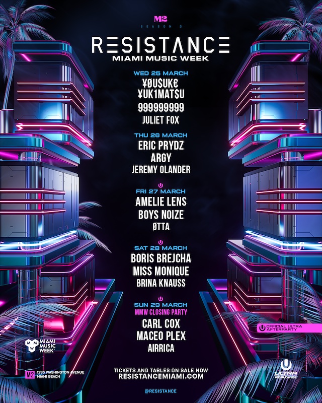 ULTRA Worldwide’s underground powerhouse RESISTANCE has revealed the complete lineup for RESISTANCE Miami Music Week 2026, taking over M2 Miami for five consecutive nights from Wednesday, March 25 through Sunday, March 29.